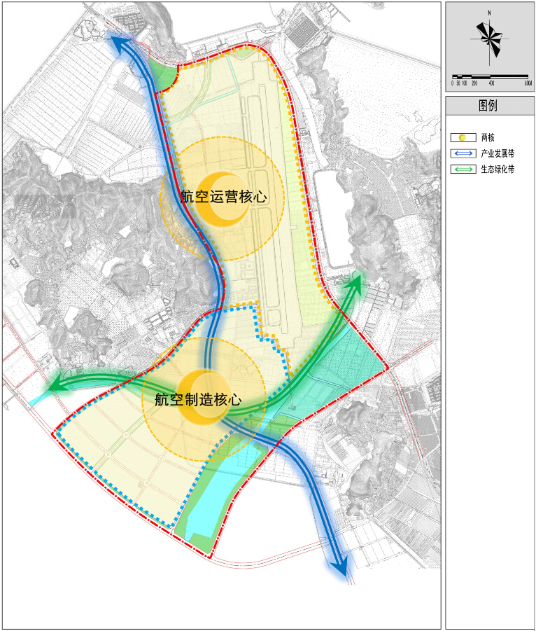 總體布局:該片區總體上形成“兩核兩帶”的規劃結構。兩核為航空運營核心和航空制造核心,兩帶為產業發展帶和生態綠帶。